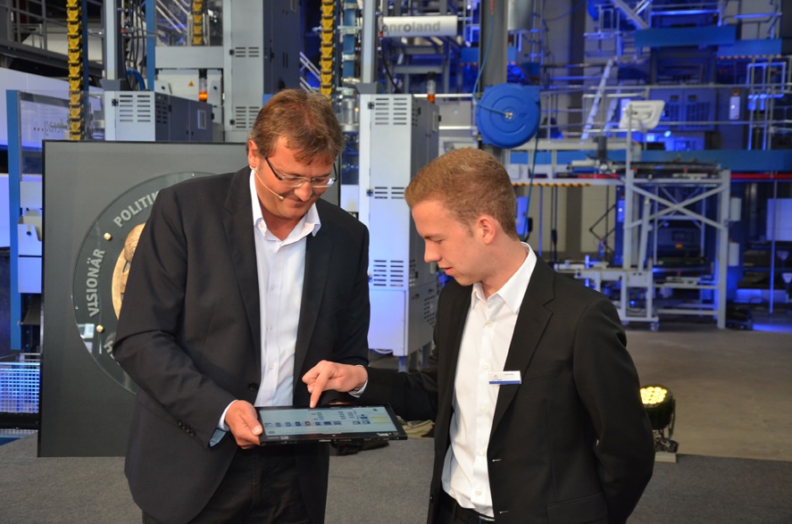 Extremsportler Marc Hauser und Leonard Weiss, Sohn des Firmenchefs Georg Weiss, nahmen die neue 96-Seiten-Offset-Rotation in Betrieb. (Foto: T. Förster)