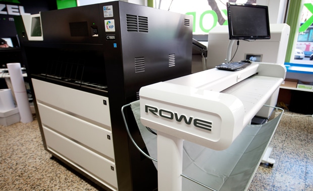 An das Drucksystem ist zudem ein Rowe Scan 650i gekoppelt. Die optische Auflösung dieser Scaneinheit beträgt 2.400 x 1.200 dpi (max. 9.600 dpi) – was selbst die feinsten Details sichtbar machen soll. Die Scanbreite eines Dokuments wird automatisch ermittelt und beträgt maximal etwas mehr als 111 cm. Auch die Materialstärke – maximal bis zu 30 mm – stellen Sensoren laut Wenzel automatisch ein. Zwei LED-Kaltlichtquellen sorgen ohne Aufwärmphase für ein schattenfreies Scannen. Selbst gefaltete, gewellte oder sehr dünne Vorlagen sollen weitestgehend ohne Fehler ausgegeben werden können.