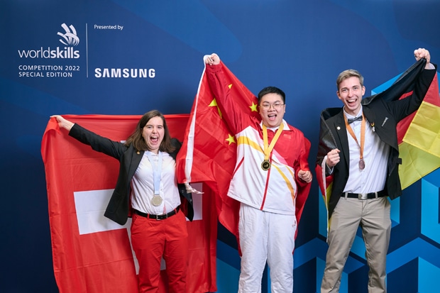 Jubel über ihren Medaillengewinn (v.l.n.r.): Nina Manser gewinnt für die Schweiz Silber, Junjie Gu aus China holt Gold und Hendrik Den Ouden erkämpfte für Deutschland Bronze.(Bild: Manu Friederich/SwissSkills)