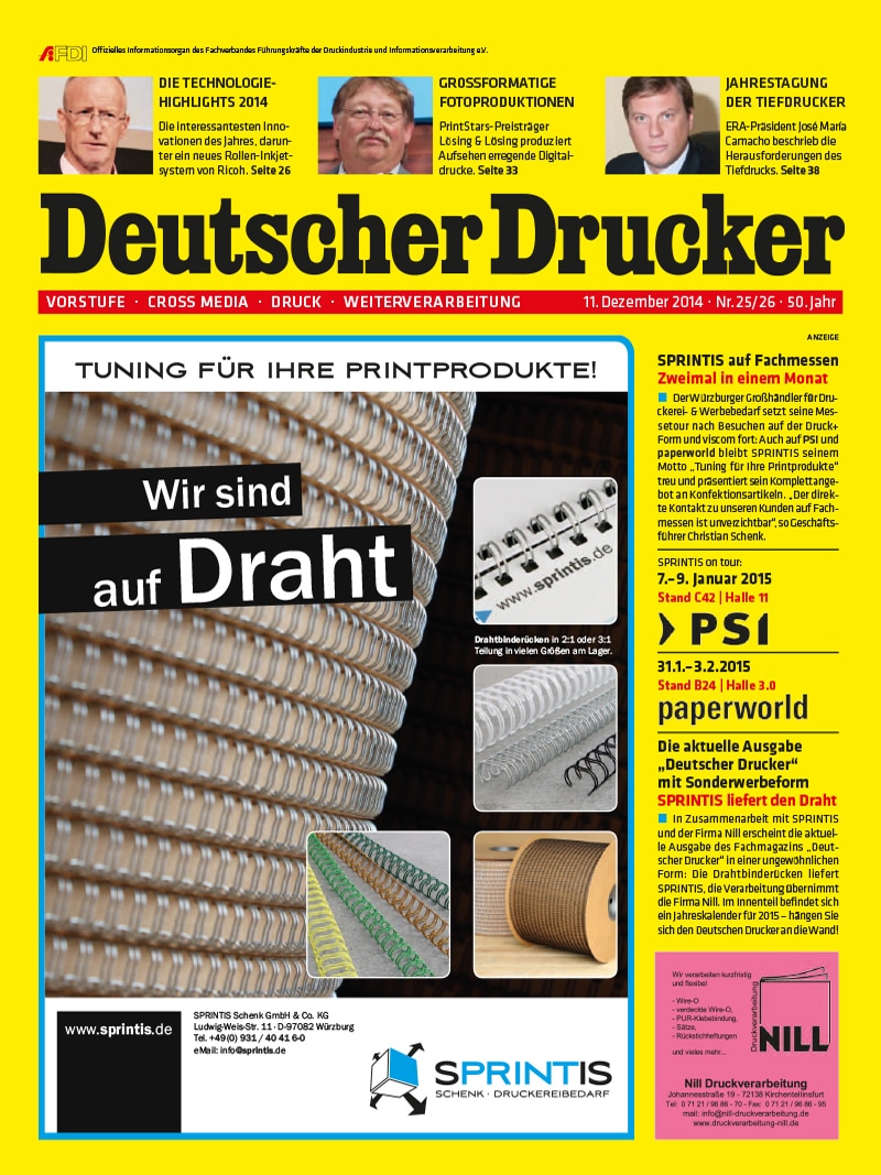 Thematisch dreht sich die Jahresend-Ausgabe von Deutscher Drucker ganz um die wichtigsten Technologien 2014 – von der Druckvorstufe, über den Digitaldruck, den Bogen- und Rollenoffset bis hin zur Druckweiterverarbeitung und zu Papieren. Darüber hinaus werden Zukunftschancen für Akzidenz- und Verlagsdruckereien beleuchtet und erfolgreiche Geschäftsmodelle am Praxisbeispiel vorgestellt.