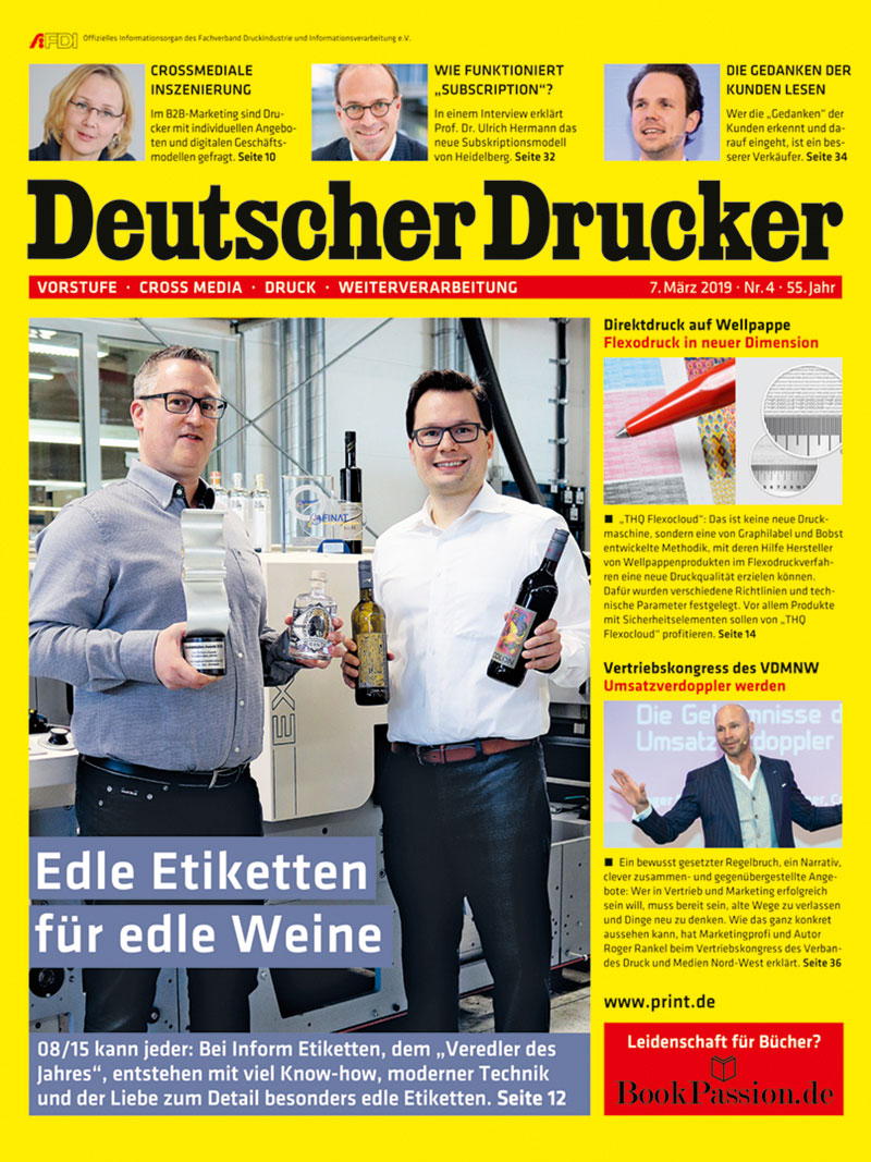KUNDEN & MÄRKTE: Print im B2B-Marketing+++SCHWERPUNKT: Direktdruck auf Wellpappe: THQ-Flexocloud ermöglicht eine neue Qualität im Flexodruck+++PRODUKTE & TECHNIK: Printed Electronics: Das erwartet die Besucher der Lope-C 2019+++BETRIEB & MANAGEMENT: Interview zum Subskriptionsmodell von Heidelberg9,50 €