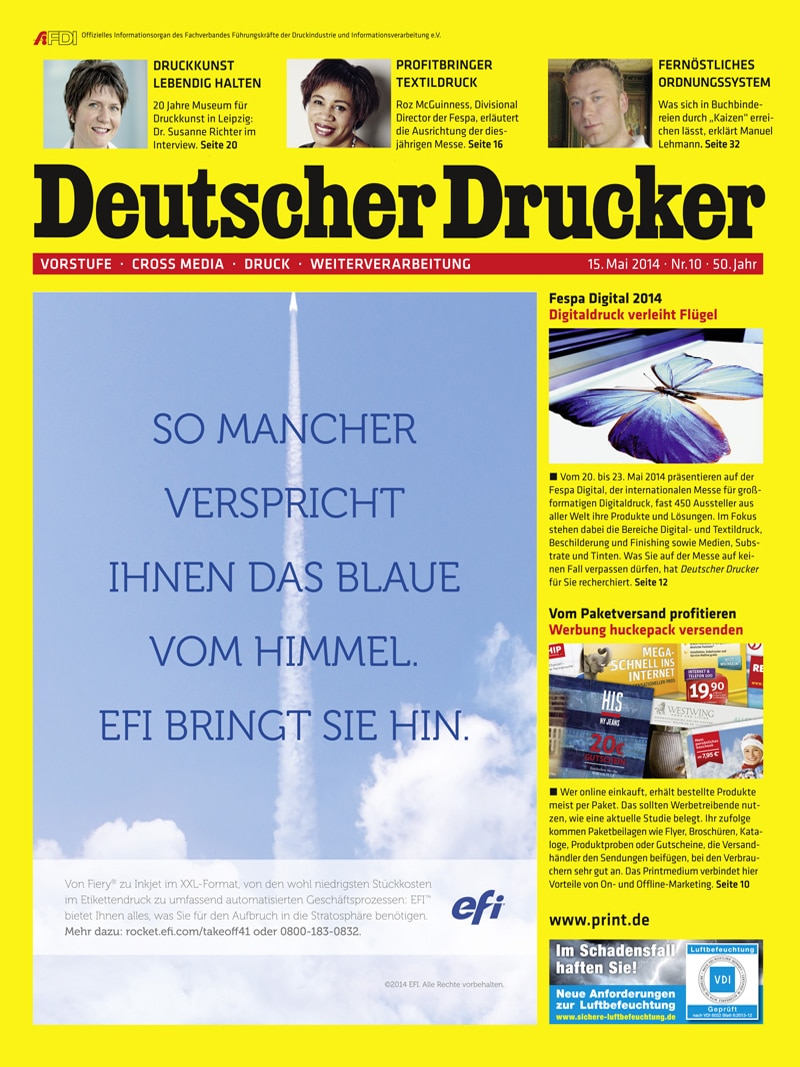 Schwerpunkt dieser Ausgabe: Digitaldruck. Fespa 2014. Profitbringer Textildruck. Prozessoptimierung durch Rückfeuchtung. Large Format Printing.8,50 €