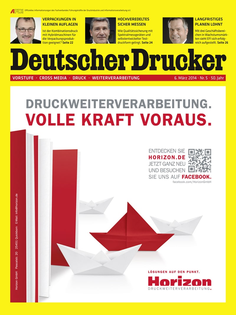 Schwerpunkt dieser Ausgabe: Druckweiterverarbeitung. Volle Kraft voraus, Lösungen auf den Punkt. Horizon8,50 €