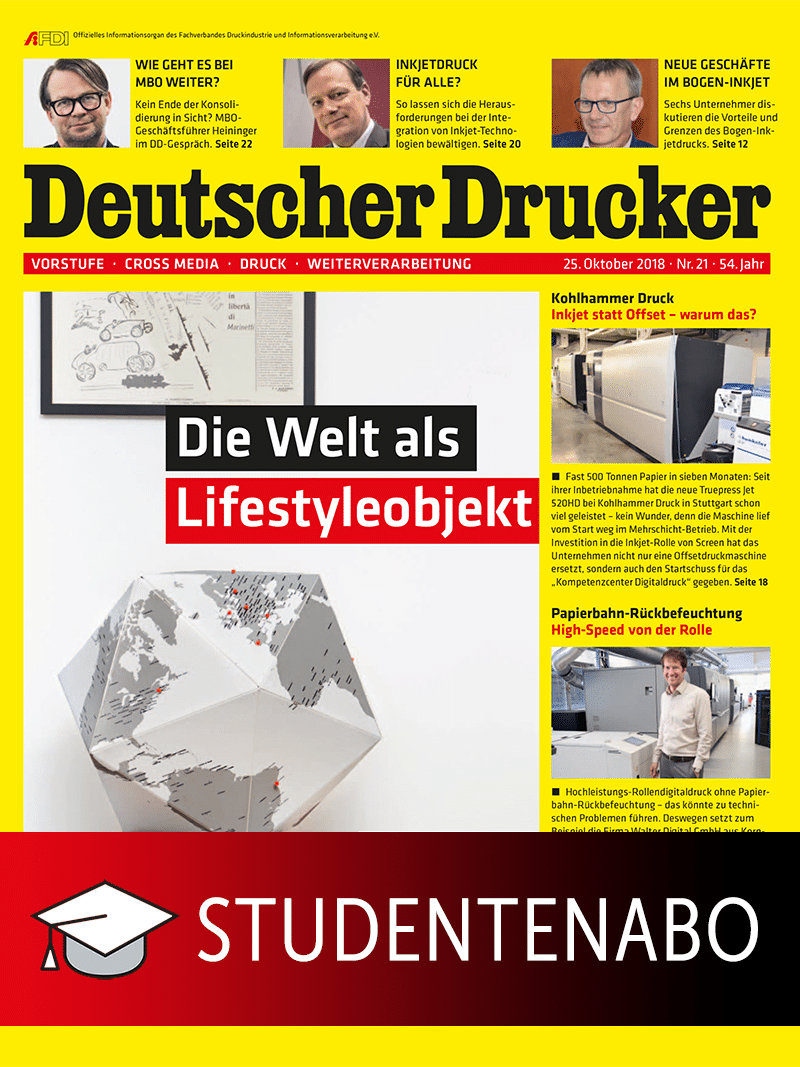 Deutscher Drucker berichtet in aufwändig recherchierten Reportagen über Vorstufenbetriebe, Druckereien und Weiterverarbeiter und gibt Ihnen Sicherheit in einem anspruchsvollen Marktumfeld. In der Rubrik Kunden & Märkte finden Sie businessrelevante Informationen aus den Märkten Ihrer künftigen Kunden. Deutscher Drucker liefert mit Management-Serien, Marktübersichten, Messe- und Kongressberichten sowie Schwerpunktthemen wertvolle Tipps für Fach- und Führungskräfte. Anhand zahlreicher innovativer Anwendungen werden Trends sichtbar gemacht. Deutscher Drucker beinhaltet einen umfangreichen Stellenmarkt.