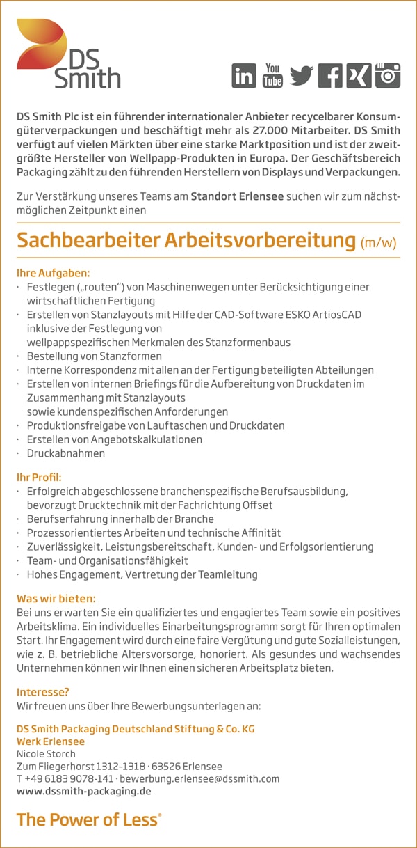 Firma: DS Smith Packaging Deutschland Stiftung & Co. KG Werk Erlensee