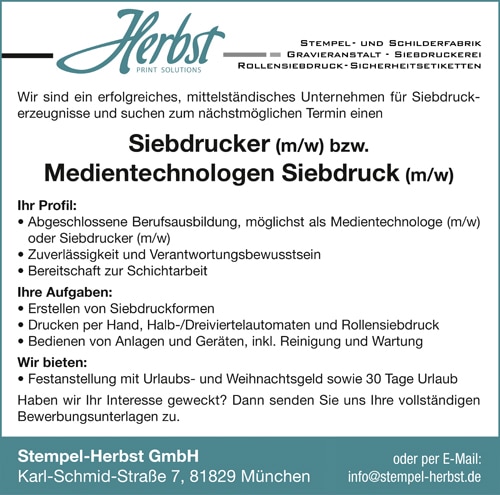 Siebdrucker (m/w) bzw. Medientechnologen Siebdruck (m/w)