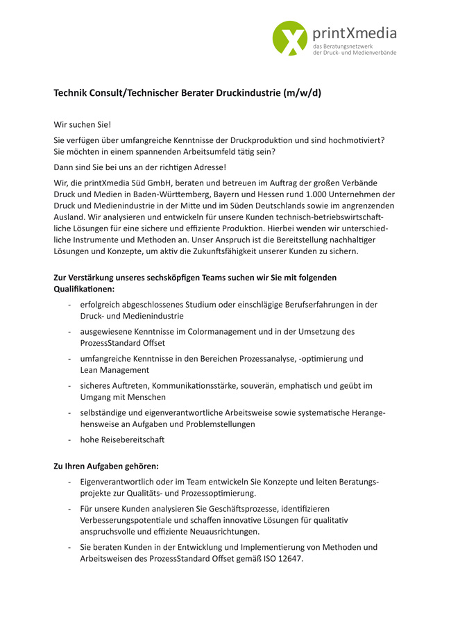 Technik Consult/Technischer Berater für die Druckindustrie (m/w/d) in Stuttgart