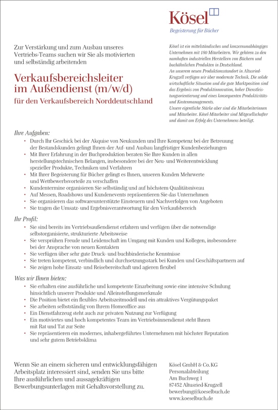 Verkaufsbereichsleiter im Außendienst (m/w/d) für den Verkaufsbereich Norddeutschland