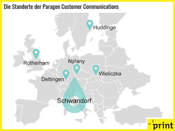 Die Einheit Paragon Customer Communications ist die größte und internationalste der Paragon-Gruppe. Zu diesem Geschäftsbereich gehören auch die Tochterfirmen der früheren Meiller GHP. Die Standorte der Paragon Customer Communications sind die folgenden sechs (siehe ebenfalls Grafik unten):